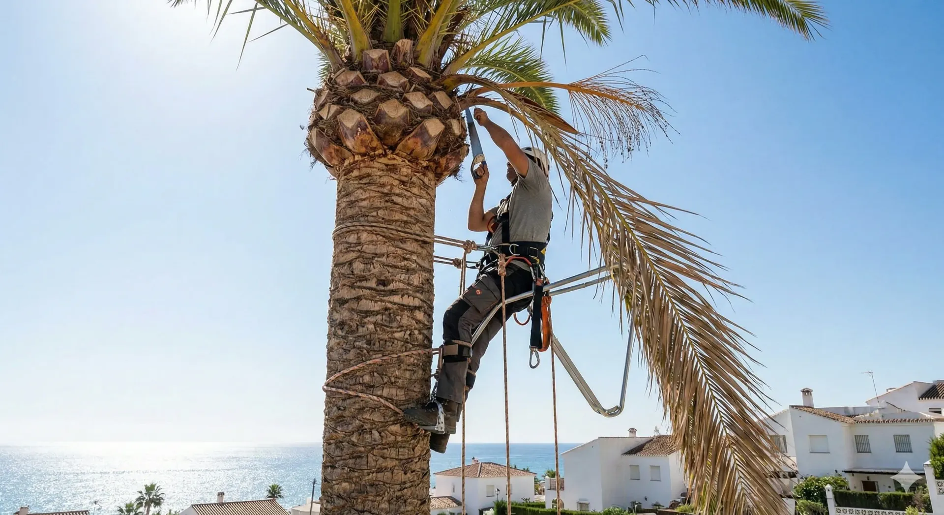 - Seguridad Sanitaria: Nuestros podadores desinfectan las herramientas entre palmera y palmera. Además, aplicamos tratamientos de endoterapia (inyecciones en el tronco) para blindar a tu ejemplar contra el escarabajo picudo. Importante: Jamás podamos palmeras en verano en Huelva, ya que el olor de la savia fresca atrae a la plaga.